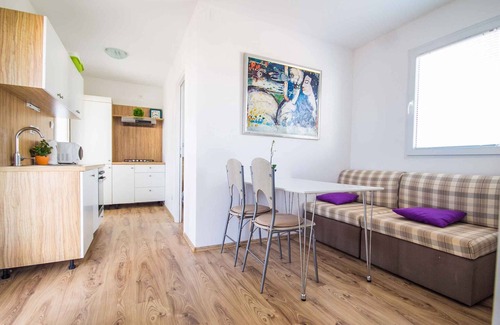 The detached mobilehome is furnished in a functional style. The property is located in a busy environment, on a campsite. Also due to its sunny location the domicile is popular. Available for use: sunbathing lawn, terrace and garden furniture.Holiday resortreception (safe, change), 3 restaurants, pizzeria, bar, coffee shop, beach bar, children's playroom, supermarket, kiosk, boutique, hair dresser and laundry. LocationKarigador. The mobilehome is located on a campsite, on a garden plot with meadow and shrubs. In the same complex are mobile homes IST NOV 501 (6 people), IST NOV 502 (6 people) and IST NOV 503 (6 people). Access is directly from the main road (asphalted). Parking (for 1 car) is available on the property. Specialair conditioning.Facilities: internet access (WLAN). TV reception takes place via satellite. LeisureIn the complex: mini golf, tennis and bike rental. Animation for children from 17 years. Adult animation. Dogsallowed, EUR 10.00/pet per day. DistancesShopping 450 m, restaurant 450 m, town center 9 km. In summer: Jadranska obala 100 m in Jadranska obala (beach 100 m in Jadranska obala featuring meadow, stones, rocks and bathing plateaus). DivisionMobilehome, 1 floor, 3 rooms (including 2 bedrooms), 32 sqm, in total 6 beds (including 2 additional beds). RoomThe entrance to your mobile home is located on the ground floor and leads over an external staircase directly into the kitchen-diner. Bedroom with 1 double bed. Bedroom with 2 single beds. Living/bedroom with 2 additional beds on couch/sofa (only suitable for children under the year of 12), sitting area, TV and access to the terrace (garden furniture). Cooking nook in the living & bedroom with electric stove (4 plates), fridge, microwave, coffee machine and toaster. Bathroom with shower and WC. Terms of lease and pricesIncluded in the priceair conditioning, parking place, electricity, water, final cleaning, bed linen, hand towels, Wireless Internet access. Side costs-Additionally(Payable when booking)/local tax.Deposit:EUR 100,-/object