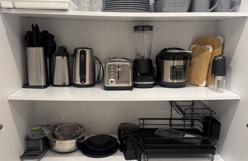 - Fully Equipped Kitchen – Includes cookware, utensils, coffee maker, and a welcome basket with complimentary snacks, coffee, tea, hot chocolate, cereal, and pasta for your convenience.