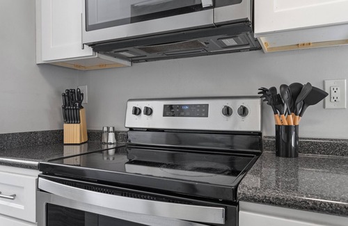 The bungalow style home was built in 1997 and features a large refrigerator, deep stainless steel sink, glass electric stove top and dining area that offers plenty of room to comfortably host family dinners. We provide everything you'll need to cook a delicious family meal including cookware, dishes, utensils, dishwasher pods, cutting boards, cookie sheets, and more. The dining table can comfortably seat four people.
