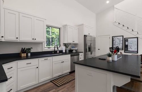 Discover a contemporary retreat nestled in the heart of Bella Vista's trail system. This modern chalet offers direct access to the renowned Back 40 trails, making it a haven for mountain biking enthusiasts. After a day of adventure, unwind in the private hot tub or relax on the deck overlooking serene woodland views. The open-concept living space features a fully equipped kitchen, comfortable furnishings, and large windows that bring the outdoors in. Whether you're seeking outdoor thrills or peaceful relaxation, this chalet provides the perfect base for your getaway