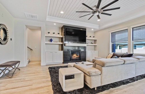 The home features four bedrooms, each beautifully furnished with high-quality linens and comfortable beds, ensuring a great night's sleep for all. The master suite is particularly impressive, with a king-size bed, an en-suite bathroom, and a walk-in closet. The second bedroom has a comfortable queen-size bed, while the third bedroom has a full over twin bunk bed, perfect for kids or young adults. The fourth bedroom has two queen over queen bunk beds, providing plenty of space for a large group of guests.