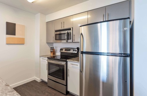 This Seaport apartment offers floor-to-ceiling windows, a modern kitchen with stainless steel appliances, in-unit laundry, wide-plank wood flooring, and spacious layouts with premium finishes.