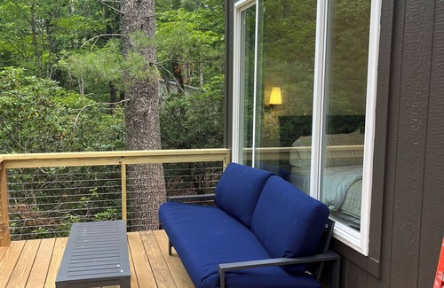 Kick back and relax in this calm, stylish space. This is the perfect space for a couple or a couple with a child or two. The elegant bedroom has a king size bed with its own TV. The bathroom features a tile shower. You will love the main room with the entire back wall of windows. Adult size bunk beds are perfect for napping or reading or for any extra guest. The kitchen has all the major appliances for that dinner in. Enjoy the view of the mountains from your private deck. The house is located close to Hiking trails, wineries, wedding venues Helen and Dahlonega.
