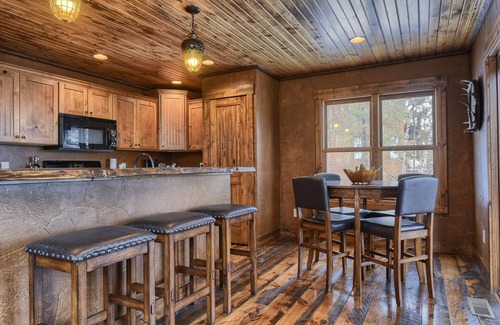After exploring throughout your vacation, coming home to the cabin will be the best part. With peaceful views from the deck area, a secluded back yard area bordering forest service, and a hot tub with a view of the stars, your vacation will be complete. The cabin is decorated rustically throughout, and includes custom log furniture to complete that log cabin feel. There's flat screen TVs in all 4 bedrooms, heated tile floors in the entryway, a stone accented fireplace in the living area and includes WiFi to stay connected. The open kitchen is great for entertaining with seating for up to 12 and there's a total of 4 bedrooms - 2 bedrooms are upstairs with queen beds, while the other 2 are on the lower level with a queen bed and a twin bunkbed. There's also a futon in the loft to complete the ability to sleep up to 12.