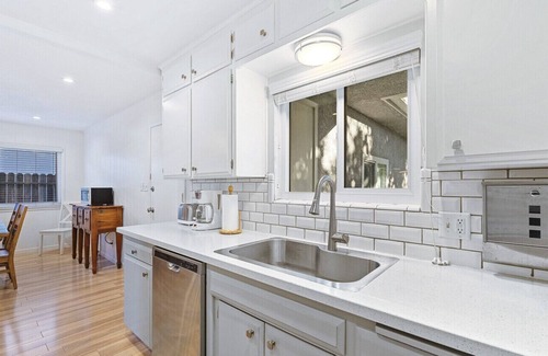 This quaint home is perfect for a family get together, business stay or just a couple seeking more space and privacy. It is holds the distinction as being the most desirable short term rental in the central valley. It offers the cleanliness and amenities of a hotel combined with the space and privacy of a home! The newly remodeled kitchen boasts quartz countertops, stylish two tone cabinets and clean modern stylings. The kitchen is fully equipped with all the cookware and appliances you would need to cook any meal.