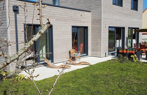House "wood feather" is a contemporary house of 150 m² located 800 m from the beach. The house totally wood is very bright thanks to its large windows. Garden of 600m ² and the south facing terrace, the view is totally cleared on the plain.