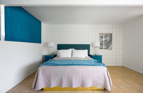 Breathtaking views of the outdoor pool oasis beckon you to take a dip in the crystal clear waters, and plush loungers await to offer relaxation – and a golden tan! Savor delectable meals at the charming kitchenette nook during breaks from the inviting California sun and spend the night in as you enjoy a cozy movie night with laughter and loved ones. The colorful suite sits beside a communal pool and features retro design, a bathroom with modern fixtures, and a kitchenette & breakfast bar. Eclectic Common spaces allow your group to come together at the lounge and enjoy time spent with each other. Plus, provided board games, nearby bars & restaurants, and the hotel’s generous BYOB policy ensure that the fun never ends!
