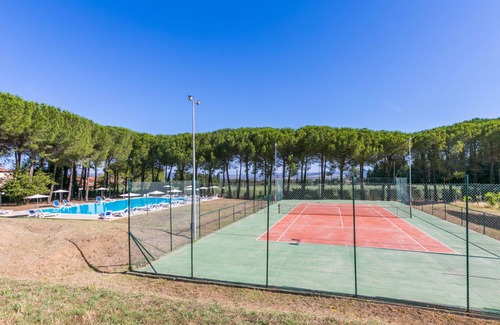 Small resort "Alberguccio Ranch Hotel", surrounded by trees and fields. 12 apartments in the residence. 3.5 km from the centre of Scarlino, 9 km from the centre of Follonica, 4 km from the sea, in the countryside. For shared use: property 50'000 m2 with lawn and trees, swimming pool (20 x 10 m, depth 140 - 250 cm, seasonal availability: 15.May. - 01.Oct.). Outdoor shower, tennis (extra). In the complex: restaurant, bar, WiFi. Breakfast on request (extra). Parking on the premises. Shop 3 km, supermarket 3.9 km, restaurant 3 km, bus stop 600 m, railway station "Follonica" 10 km, ferry "Piombino" 43 km, sandy beach "Puntone" 4 km. Sports harbour 6 km, marina 6 km, golf course (18 hole) 10 km, surf school 7 km, riding stable 7 km. Nearby attractions: Cala Violina 9.5 km, Massa Marittima 19 km, Castiglione della Pescaia 23 km. Well-known lakes can easily be reached: Accesa 19 km. Hiking paths: Mountain-bike 600 m. Please note: the owner has a dog.