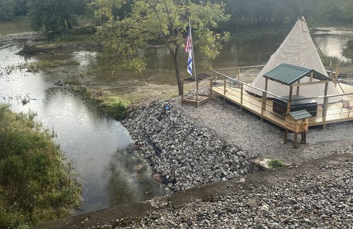On the banks of the Indianas State river the Wabash . Just off your deck you are suroundded by water . Looking up you will see Bald eagle soaring above the majestic canopy of towering Cottonwoods , Shag Bark Hickory , Walnuts and state tree -Sycamore .Your lodge is a 20 20 ft Tee Pee . Beautifully decorated with era artifacts , modern bed ,fridge ,ice machine . and much more .( PLEASE understand the hot tub is an amenity .Due to the covid pandemic We have implemented a policy of draining the hot tub after each customer . Then cleaning the entire system! Which in turn is am costly expense . I have chosen to give the customer a option to pay for hot tub or decline . A CHOICE . Please advise in the rental process of your choice . )