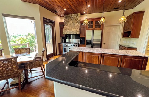 The kitchen is a chef’s dream come true complete with five burner gas range, a gorgeous stone façade vent hood, Keurig coffeemaker, stainless steel refrigerator and dishwasher- for easy clean up. Just off the kitchen is a large storage area complete with full size washer and dryer. the large dining table provides seating for 8 and there are 2 stools at the kitchen island for additional guests.