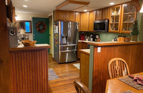 Living room open to Kitchen and Dining room. Comfortable couches to relax on. Kitchen has everything you should expect from your home kitchen including Coffee maker, pots/pans, utensils and storage containers.