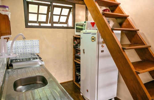 At Chalé da Montanha, you wake up to the sounds of nature and enjoy one of the island’s best sunsets. With space for up to 4 people, the chalet offers a cozy atmosphere, a fully equipped kitchen, a veranda with a hammock, and a spacious garden—perfect for children and pets. The main bedroom is upstairs, accessed by a steep staircase, adding to the rustic charm of the place. The living area includes a single bed and a trundle bed, providing comfort for all guests.
