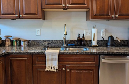 Kitchen | Large kitchen fully and thoughtfully stocked with high-end items including drip and Keurig coffee makers (ground coffee/sugar/creamer/tea provided), Ninja blender, griddle, waffle iron, toaster, crock pot, electric and stovetop kettles, Wusthof knives, children’s dishes and cutlery, olive oil and full set of spices. You have everything needed to prepare and serve a meal for your group, including seating for 6 at the peninsula.