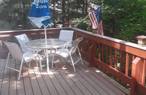 This home also offers everything needed for outdoor fun. It includes a spacious deck with outdoor dining, lounge chairs, a charcoal grill, and a fire pit. Additionally, there are cozy Adirondack chairs available on the front patio. Guests can use a tandem kayak to explore the lake, and adult life jackets are provided.