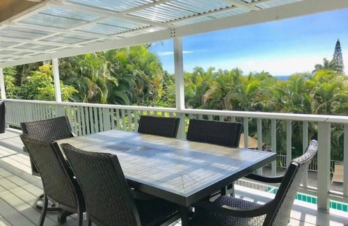 My Kona Paradise is large, bright and elegantly appointed. A modern Hawaiian home, it's 2800 sq.ft may be easily shared by two families or 3 or 4 couples. Yet it retains a sense of seclusion and privacy. In an upscale neighborhood on the slope of Mauna Loa, the wide lanai overlooks the yard, the sparkling pool, palms and landscaped tropical greenery. It is directly above downtown quaint, active Kailua Village, which is situated along a wide bay on the Kona Coast.