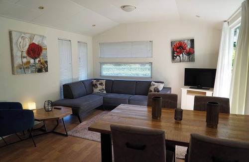 T-model 4 stands out because of its T-shaped building style and playful character. The detached chalet is suitable for 4 persons and has a ground floor. The living room has a cosy sitting area with television, a dining area and a kitchen with a dishwasher, refrigerator and coffee maker. The chalet has 2 bedrooms, both with 2 single beds. The bathroom has a shower, sink and toilet. In the garden you can enjoy a furnished terrace. You can park 1 car at T-model 4 and there is free Wi-Fi.