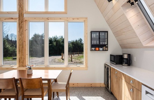 A brand new A-Frame! Construction was completed in March and we`ve spent the spring getting it ready for our guests. The cabin features 3 queen bedrooms and 2 bathrooms. When we designed this A-Frame we worked hard to ensure that the beautiful `A` architecture was the star, while also maximizing space and comfort. This isn`t your grandpas A-Frame with a metal spiral staircase and open loft with shag carpet (although we love those too). The layout is spacious and each bedroom has it`s own charm and privacy. The open concept kitchen/dining and living space allows your entire group to unwind, cook and connect. In addition to the bedrooms, there is a small loft with a work area and game nook. We kept the design modern with a touch of whimsy. Some standout features include the beautifully tiled showers and the polished concrete floors that have pieces of Petoskey stone and Leland blue stones from our own beach adventures hidden throughout. Stay cozy with in floor radiant heat and a powerful gas fireplace in the winter and enjoy AC throughout the house in the warmer months. This cabin sits on 8 wild wooded acres. We are slowly starting to create some walking paths and there is plenty to explore.