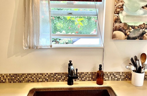 The Bungalow studio offers a lite & open indoor space with vaulted ceilings and polished concrete floors. The studio has a new queen memory foam bed, both soft & firm pillows and high quality linens. Ample closet area for hanging clothes and a tall useful dresser. The kitchen offers an over-sized hammered copper sink, induction cook top, convection oven, toaster oven, microwave, full size refrigerator and BONUS euro-style washer/dryer combo. Open shelving and a generous pantry round out a fully equipped kitchen. Dining indoors or alfresco offers bamboo, canyon and nature views. Versatile counter space for dining or working. A soft leather chair to sink into while enjoying your favorite book or TV shows. The Bungalow bathroom features a copper sink and oil rubbed bronze finishes. The shower offers adjustable massage shower head and subway tiled walls. The courtyard is a lovely spot to enjoy morning coffee or evening wine - all while taking in the bamboo and canyon views.