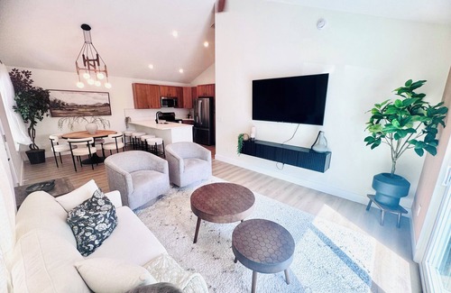 The open-concept living room and modern, fully equipped kitchen make this home perfect for family meals.