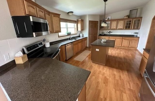 This 3 bed, 3 bath home is ready to be filled with guests! Lots of space and new updates. A large home with a detached garage. Walk up to two separate entrances, one goes directly into the living area, and the other goes into a utility room, directly off the Kitchen. The amazing gourmet kitchen is spacious and has a ton of room, counter space, cabinets, an island, and a peninsula. Amazing wall of glass door cabinets coffee bar. French door refrigerator, above-the-range microwave, and glass top electric stove. Keurig and regular coffee maker, toaster, and a blender. The dining room and living room are off the kitchen. All newly designed, and up to date. 2 bedrooms, 2 bathrooms on the main level. One Queen bed, and one full. Lower lever game area with a foosball table, one queen bedroom, and one bathroom. Walk out of the basement right to the lake. Large raised deck off the dining room. Relax and listen to the waves. A perfect evening by the lake making smores in the fire pit in the backyard next to the lake. A set of stairs down to the water, where there is a nice dock with seating. Steps from the dock into the water off the dock. All toiletries, linens, towels, and beach towels are provided. Call Sota Lake Properties to rent a boat or a pontoon. We also have lake toys available, kayaks, paddle boards, and water mats.