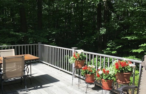 Both cozy & quaint, our home offers an open layout with vaulted ceilings and a floor to ceiling wood burning fireplace. The oversized glass doors and skylights bring the outdoors inside and provide the living areas with lovely natural light! Our spacious patio deck gives you ample area to enjoy dining al fresco or merely sitting out and taking in the soothing sounds of mother nature.