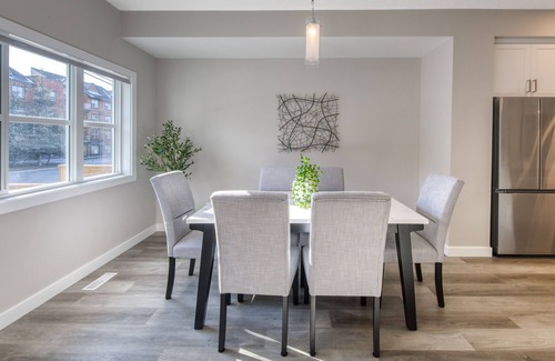 Dining Room Area: A modern dining room area next to the kitchen for guests to sit and eat at a dining room table.