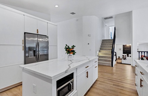 A fully-equipped gourmet kitchen lined in granite countertop is sure to inspire your inner chef. Stainless appliances include a side-by-side fridge, a gas range, and a standalone hood. The huge island offers plenty of space for meal prep. In addition, there is a Keurig coffee machine with free coffee pods, and lots of dishes/bowels/utensils, etc. When it's time to eat, gather around the six-person dining table to share your home-cooked creations. Another dining table on the patio invites alfresco meals as well as extra countertop stool chairs serving additional people.