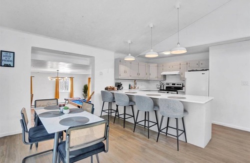 The home uniquely has two living rooms with 65 in TVs. One can be used by the adults, one by the kids. Pool table, air hockey, pacman retro arcade, electric fireplace, and board games all included.