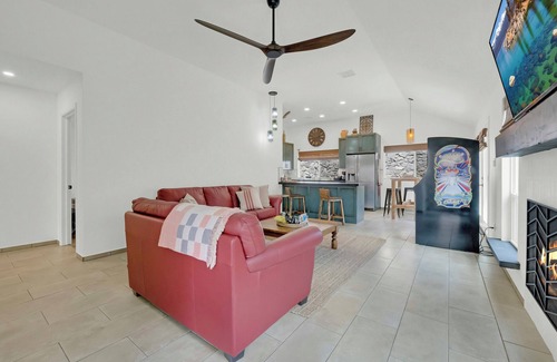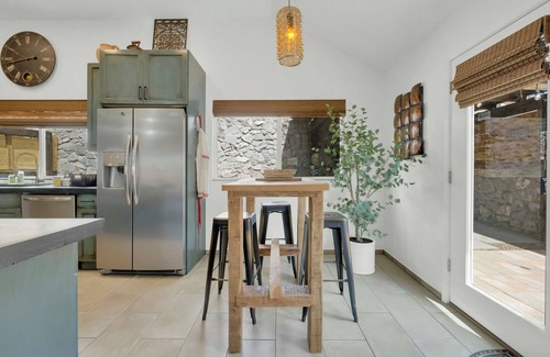 Take it easy at this unique and cozy getaway. Offers ample indoor lighting and an open floor plan. Fully stocked kitchen with quality cookware at your disposal. Full size classic arcade beckons to be challenged! Carefree outdoor living with large lit covered patio, greenery, private fenced yard with Weber grill. Master suite and spa features a King size Posturepedic mattress and soaking tub. Relax and sink into the comfy, soft Italian leather couches as you listen to a vintage vinyl collection.