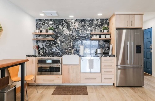 The kitchen, covered in unique granite is packed and efficient. Bosch induction stove for instant heating, a Cafe combined connection, broiling and microwave oven, a Fisher+Paykel drawer dishwasher and ice-making refrigerator. Some spices, Ninja full-size blender, toaster, drip coffee maker, tools, dishes, glassware and flatware slow you to let your inner Julia Child free.