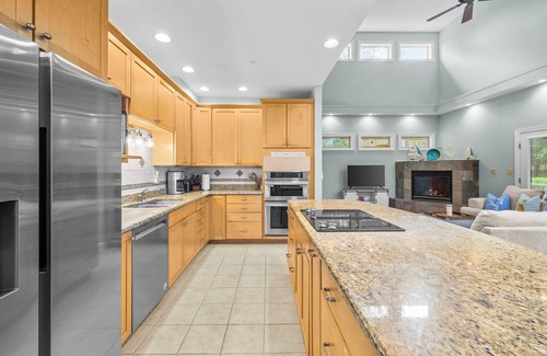The first floor (main floor of the house) features a vaulted ceiling with large windows that wrap around, letting natural light in from all sides. The living room provides couch seating, board games, smart TV with Netflix, and gas fireplace. Perfect for cozy nights in. There is a large dining table set for 6, with an additional 4 bar seats included at the island. The kitchen offers a coffee maker, coffee grinder, toaster, air fryer, microwave, oven, and stove top. You’ll also find the master bedroom connected to the master bathroom, featuring his and her vanities and a walk-in tile shower with bench. Through the large laundry room will lead you to two additional bedrooms and full bathroom. Giving you a total of 7 beds on the main floor.