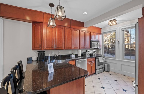 Step into this cute condo and you're greeted by a large living room on your left, with a pull out couch and a Smart TV. This space also has great views of the beautiful and bustling commons of Salem. Make your way into the full kitchen, equipped with everything you need for cooking, and a great breakfast bar with 4 stools. Off of the kitchen you can also find a half bathroom with a washer and dryer.