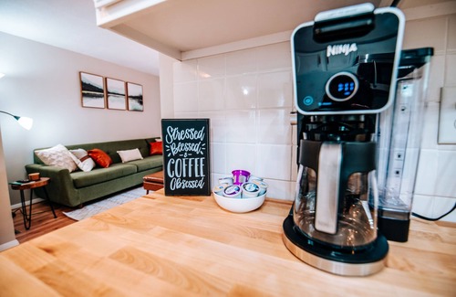 Kitchen: Fully stocked kitchen with appliances such as toaster, ninja coffee machine, and blender. Large enough island to sit 8. *Please Note* there is no dishwasher on site.