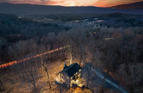 The Hilltop Station – A Stunning Cabin Retreat! Perched high on a hill. This brand-new, 3-story, 4-bed, 4-bath cabin offers a luxurious escape near Luray Caverns (10 min away). With cathedral ceilings, stylish furnishings, and a full office, it’s perfect for large families. Kids love the daily passing train (11 AM–1:30 PM) for a fun, front-row experience! After hiking, rafting, or exploring, unwind in this serene retreat with breathtaking views.