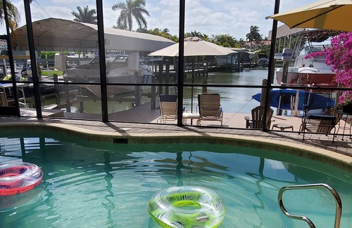 Welcome to The Fort Myers Beach Retreat! Three-bedrooms, two-bathrooms. Spacious living quarters inside and out. Open-concept floor plan with a large living, dining room and a relaxing sunroom with fountain views. Relax with waterfront views from the private, heated pool, or catch some rays on the dock while watching for dolphins and sea life in the saltwater canal. Skip the stressful beach parking search with a 5 minute walk to the public entrance to Fort Myers Beach! Enjoy a day on the water exploring the saltwater canals with the two kayaks this property provides. Rainy day? This beach house is stocked with board games, movies, and a whole shelf of adult and kids books to make the best out of your vacation. Grab a partner and take a bike ride with the two bikes this beach house provides, down to Times Square of Fort Myers Beach, a variety of beachfront retail and restaurant establishments with the famous pier, be sure to check out the Times Square live music schedules. This beach house has it all! Dog friendly!