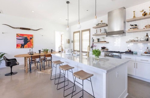 Indulge in an artsy ambiance with captivating, eclectic touches at our urban cottage, a short hop from the Vine wedding venue and Round Top, TX. A masterpiece of style and comfort. Immerse yourself in the enchanting atmosphere, enhanced by unique artistic details. Unwind by the firepit in the tranquil garden, where creativity flows freely. Experience the allure by booking your stay now for an unforgettable escape!