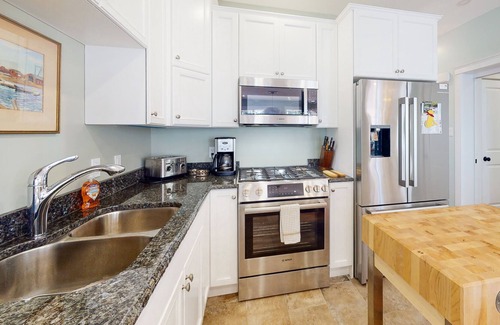 This gorgeous, classically-decorated home features three bedrooms, a well-equipped, full kitchen with stainless steel appliances and counter seating, an adjacent dining area with a table for six for meals or rainy day games, and comfortable living spaces for socializing or streaming your favorite TV channels.