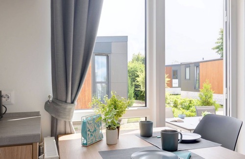The mobile home comes equipped with an open kitchen, complete with an oven, gas stove with two gas rings, a kettle, and an electric coffee machine. The bathroom features a shower and toilet. For your comfort, gas heating is available throughout the unit. Outside, you'll find a terrace with furnished seating, perfect for enjoying the outdoors. A reserved parking spot for one car is also provided at the house.