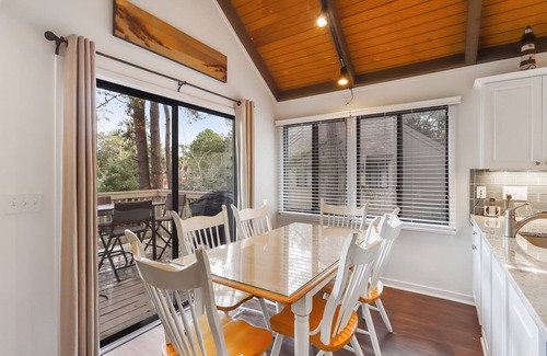 Night Heron offers privacy while still being close to all the amenities that Sea Pines has to offer. The main floor features a renovated kitchen, living and dining room, primary bedroom/bath and bedroom/bath also located on the main floor - each with a Queen size bed. On the second floor there is a loft which has two twin beds, ideal for kids looking to have there own space. It is accessed by a spiral staircase. The deck features a great view of the lagoon and trees surrounding the cottage, high top table with four chairs and a gas grill.