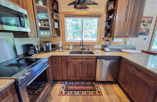 The Nordic Village Cabin is a 2 bed, 2 bath vacation home. In addition to the 2 bedrooms, there are 2 queen size hideaway beds (however, the total number of guests allowed is limited to 6). The kitchen has a bar with seats for 5 and the dining room comfortably seats 6. The living room space has a gas fireplace and a smart TV. There is a full washer & dryer in the mud room. The property has a larger covered deck and a large covered patio with a bbq and space for outdoor dining on the picnic table. This purpose built vacation home is exceptionally well equipped and organised for vacation rentals; thoughtful features include air conditioning throughout, electric window shades, and even a back up generator