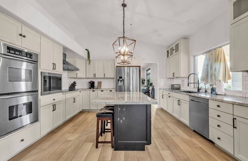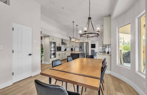 Newly remodeled retreat in North Scottsdale on nearly an acre. This 3,100‑sq‑ft home offers 4 stylish bedrooms and 3 baths, each bedroom with immediate bath access. Sleeps 8 (plus flexible options, including a bunk bed). Primary suite features a king bed and vegan‑leather loveseat. Entertainer’s backyard: 6‑person hot tub, pool (not heated), propane BBQ, fireside seating, and putting green. RV gate/parking and a 3‑car garage add convenience—desert serenity near dining, golf, and trails.