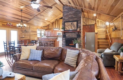 Back at the cabin, enjoy cozy evenings around the fire pit, perfect for s’mores under the stars ✨. The large wraparound deck is ideal for gatherings, and the spacious living room with a big-screen TV sets the stage for movie nights or catching up on your favorite shows.