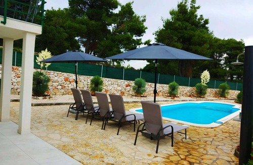 This beautifully decorated holiday home with pool is located in Stomorska on the island of Solta, near Split. It is situated in a secluded place in a beautiful natural setting overlooking the bay Gornja Krusica, surrounded by pine trees and near the beautiful pebble beach. The house extends to the ground and first floor connected by external communication. The covered terrace is overlooking the sea. As additional amenities there is an entertainment room with table football and darts. Garden contains a swimming pool, barbecue and children's facilities. Taste the local gastronomic offer, and visit the historical city of Split, which is an ideal excursion destination due to good ferry connections with the island.