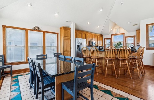 Step into the heart of Ocean Paradise, where a state-of-the-art kitchen awaits the culinary enthusiast. Gleaming granite countertops contrast beautifully with warm oak cabinetry, creating an ambiance of rustic elegance. Modern stainless-steel appliances, from the spacious fridge to the efficient oven, ensure that every meal, whether a morning brunch or a seaside dinner, is prepared with ease and style. As you brew your morning coffee or mix a smoothie, gaze out of the generous windows, which offer tantalizing glimpses of the shimmering ocean beyond. It's not just a kitchen, but a stage where delightful memories are crafted and shared. The large, open kitchen features a dishwasher and microwave as well as a breakfast bar with seating for 6. Eight bedrooms, including 5 with their own private baths, give everyone their own space, and the additional seating areas, including 2 dens, a sunroom, and game room with pool table, allow family members to gather in several areas for games, movies, and conversation.