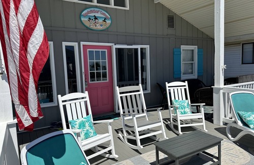 A large front deck, with ocean views and comfortable seating is a great place for families and friends to relax and unwind. Enjoy your morning coffee or an evening cocktail while gazing at the tranquil sea from a porch rocker. A front "pebbled" parking area provides ample parking along with additional relaxation space under and behind the home - perfect for grilling and enjoying the outdoors. You will find a picnic/game table (tic-tac-toe & checker board top!), corner bench seat with table, and built in tiki-bar counter with stools. A hand painted shuffleboard and hopscotch area along with corn-hole game provides hours of family fun! Adirondack chairs and 2 large hammocks encourage relaxation as you take in the salt air and ocean breezes. A large, enclosed outdoor shower (hot & cold water) is perfect for rinsing off the sand from a long, lazy day at the beach. Plenty of boat cleats and hooks to hang towels and bathing suits. The beach access is conveniently located just a few houses down on Shelby Street...a short 2 minute stroll! Close enough to the cottage for lunch and bathroom breaks!