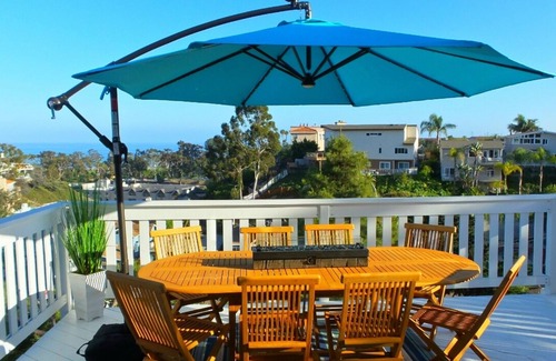 Beautiful and fun, solar powered 2,460 square feet home with ocean views from every room. Short walk to Doheny Beach and Dana Point Harbor and a shorter drive. You may not want to leave the house though because inside you will find beautifully made, comfortable beds with soft, white sheets plus each bedroom has its own full bathroom with bidet. All bedrooms are downstairs and entry and living areas are at ground level.