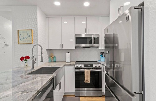 Recently updated (Winter of 2021) kitchen and bathroom, the kitchen waterfall counters with high end appliances and the bathroom marble counters with new stunning cabinets in both kitchen and bathroom, the upgraded flooring has been updated for a clean look and feel. New furniture and Smart Tv's in front room and bedroom including a queen sleeper sofa in living room.