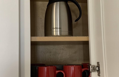 There are 2 private bedrooms in a split layout for privacy – large, primary bedroom with king bed and 2nd bedroom with queen bed. New mattresses and super-comfortable (I am often asked what the king mattress is!). Minimum 4 bed pillows per room, 2 firm and 2 softer. Remote controlled Hunter ceiling fans in both bedrooms and living room. Ceiling fan in the kitchen too.