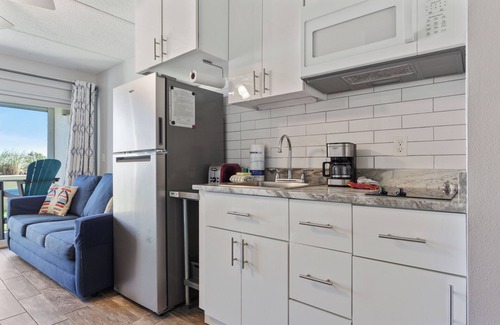 The cozy oceanfront patio suite will delight you into staying as long as you can by the seaside. Nestled in the sand dunes, this ocean view patio provides a peek at the ocean on one side and enchanting sea oats swaying in the sand dunes on the other. Enjoy the sea breeze from your oceanfront living room with queen sleeper sofa and large flat screen tv. Basic TV cable channels (as of 3/2025) or smart tv features available. Eat in, as this condo has modern kitchen amenities equipped with 2 burner stove top, microwave, toaster, coffeemaker, refrigerator and kitchen sink. This condo has a bathtub shower combo and corner vanity that gives a bit more room than the typical Beacher's Lodge bathroom. Retreat to the king sized bed in the private bedroom and enjoy the flat screen tv and custom closet shelving. This condo has daily housekeeping service included in the rate for nightly and weekly stays, once a week housekeeping on monthly stays. Pets allowed, 2 pet max, $75 per pet per stay. Grass outside of patio is not a dog walk area. Daily housekeeping service included in nightly rate for nightly or weekly stays, once a week housekeeping in monthly stays. Minimum age to rent is 21 years old