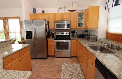 Top Level: Great room with TV/DVD and deck access, dining area seating 8, kitchen with breakfast bar seating 6, half bath, Ships Watch with game table/additional dining for 4, and a King Master Bedroom with TV/DVD and deck access. 2 gas grills on the deck.